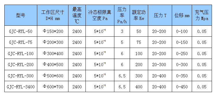 (4)溫度范圍廣,加熱元件多種可選,例如石墨、鉬、鎢、鉭等,在合適的保護氣氛中,溫度可達2400℃ ,可適應不同材料的熱壓燒結;